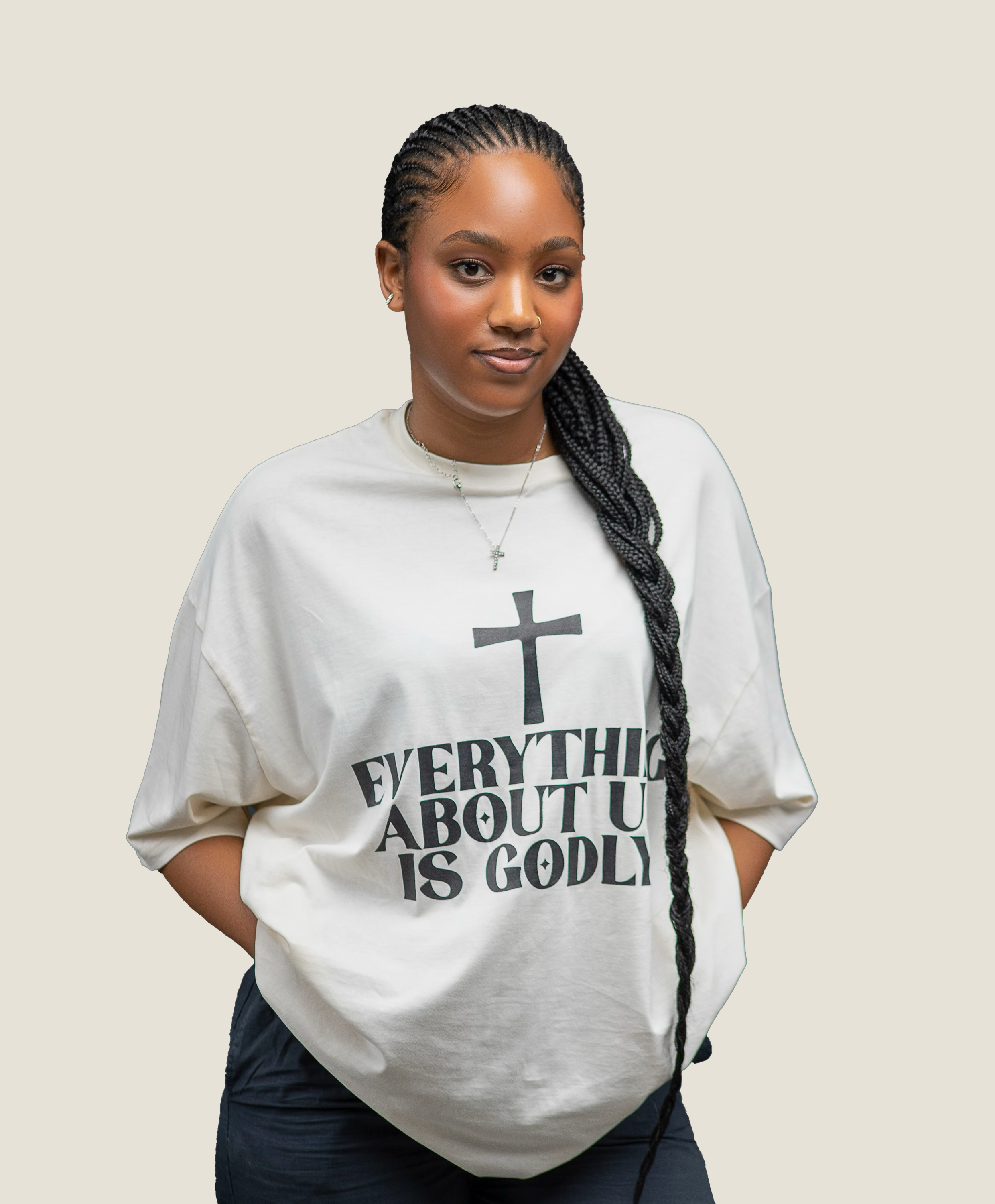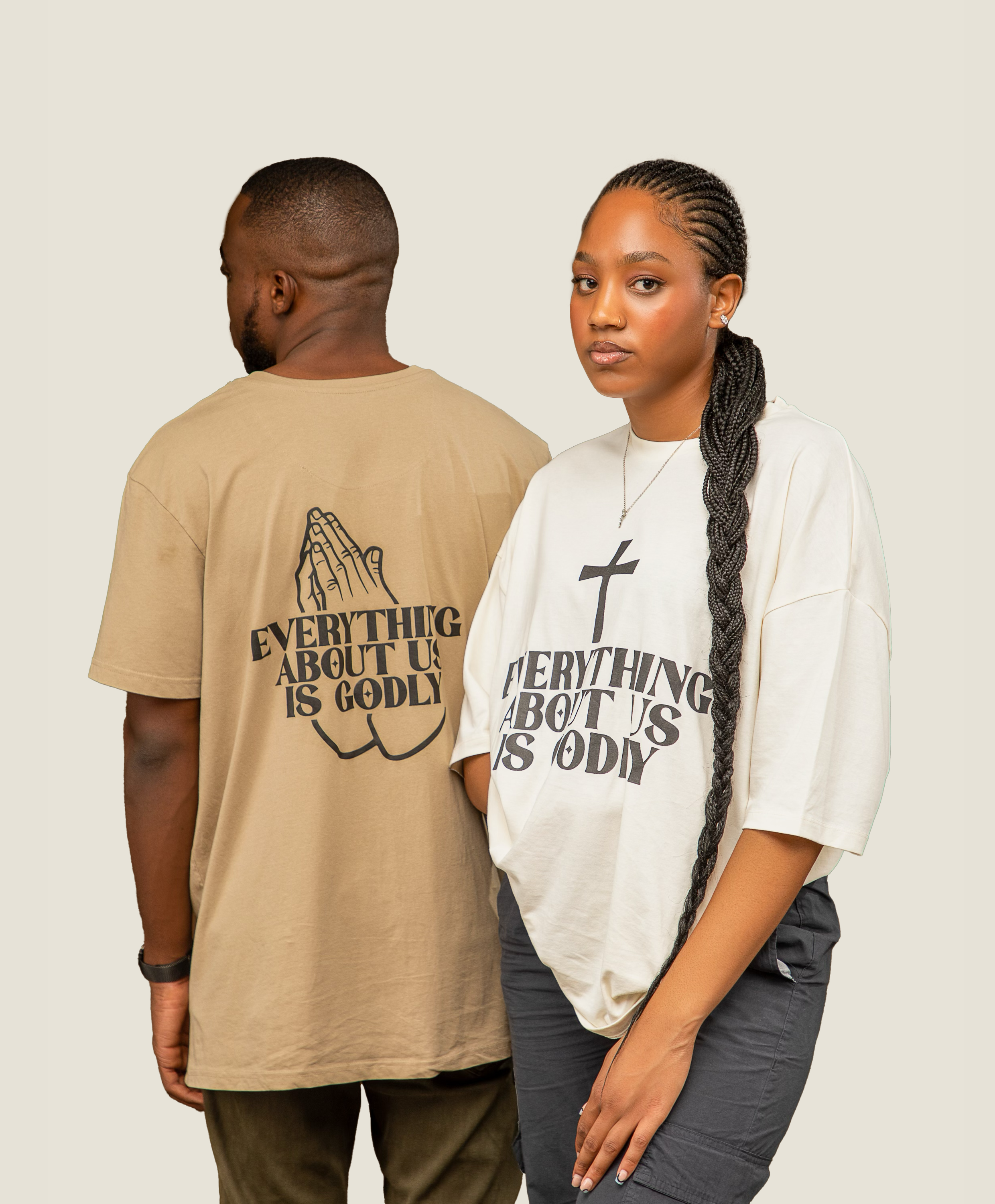 Everything we are, everything we do, is rooted in Him. This ‘Everything About Us is Godly’ tee is a bold declaration of faith. Featuring an intricate design of praying hands on the back, this piece serves as a reminder of the power of prayer in our daily walk with Christ. Whether you’re at a gathering or out in the world, wear this tee to express your unwavering commitment to Him.