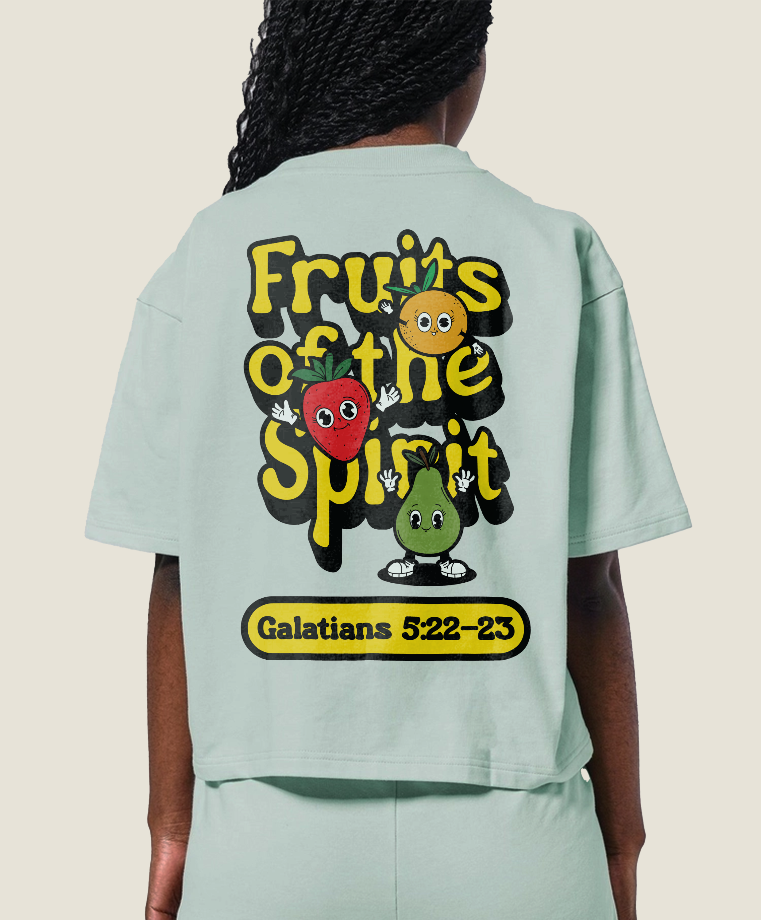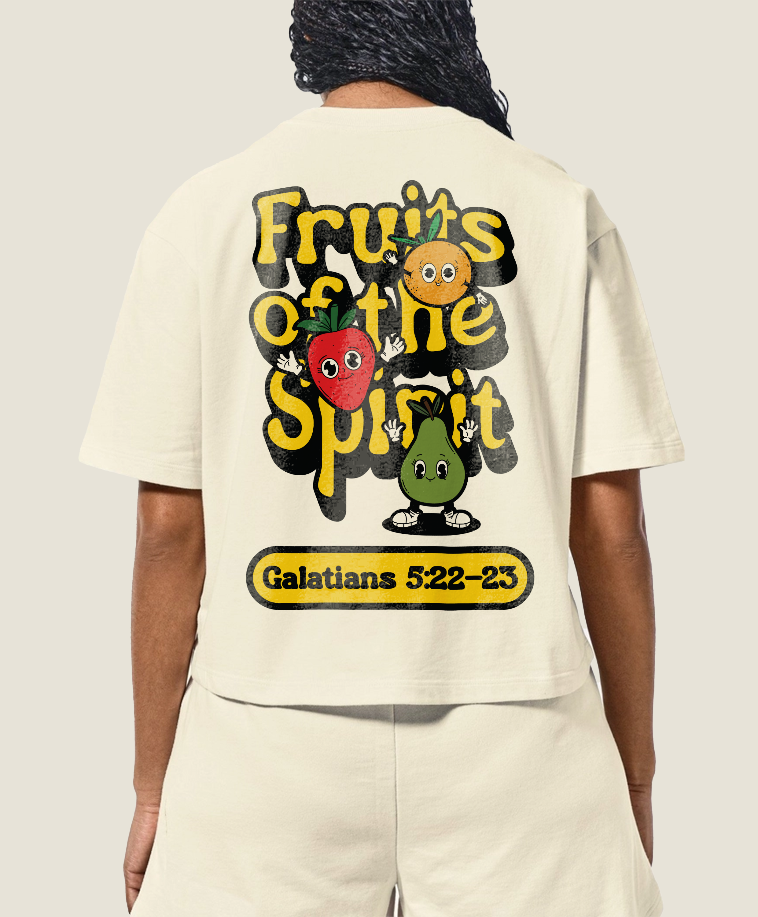 This VSSL t-shirt is part of our Fruits of the Spirit collection, inspired by Galatians 5:22-23. The back features a fun and vibrant illustration of fruits symbolizing the virtues of the Spirit, with a specific focus on Love. The playful characters and bold “Fruits of the Spirit” text make it a perfect blend of faith and fashion.