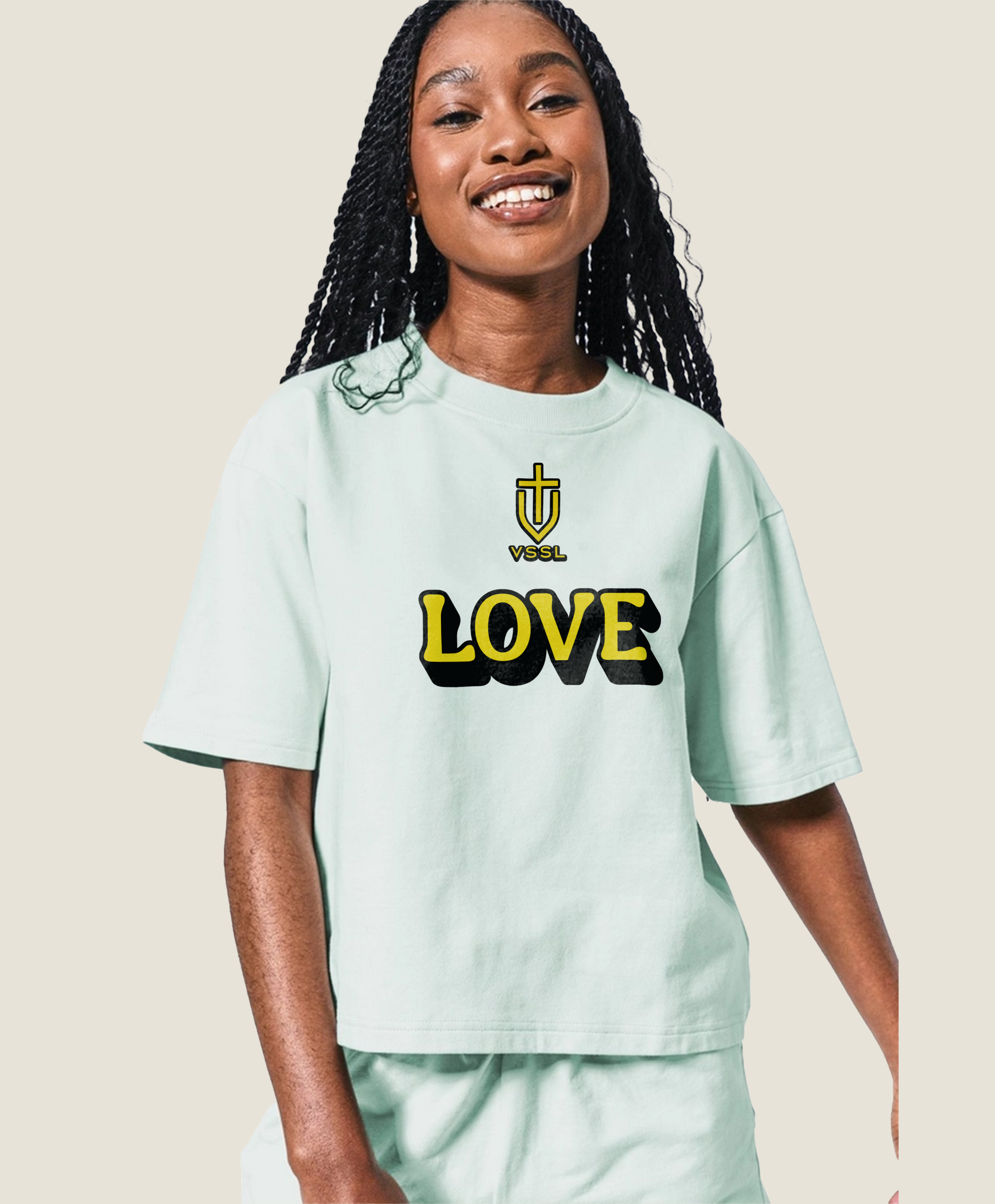 On the front, the t-shirt sports the “VSSL” logo alongside a unique graphic representing Love, one of the core fruits of the Spirit. The message is clear: live out your faith in every aspect of life, and wear it proudly.