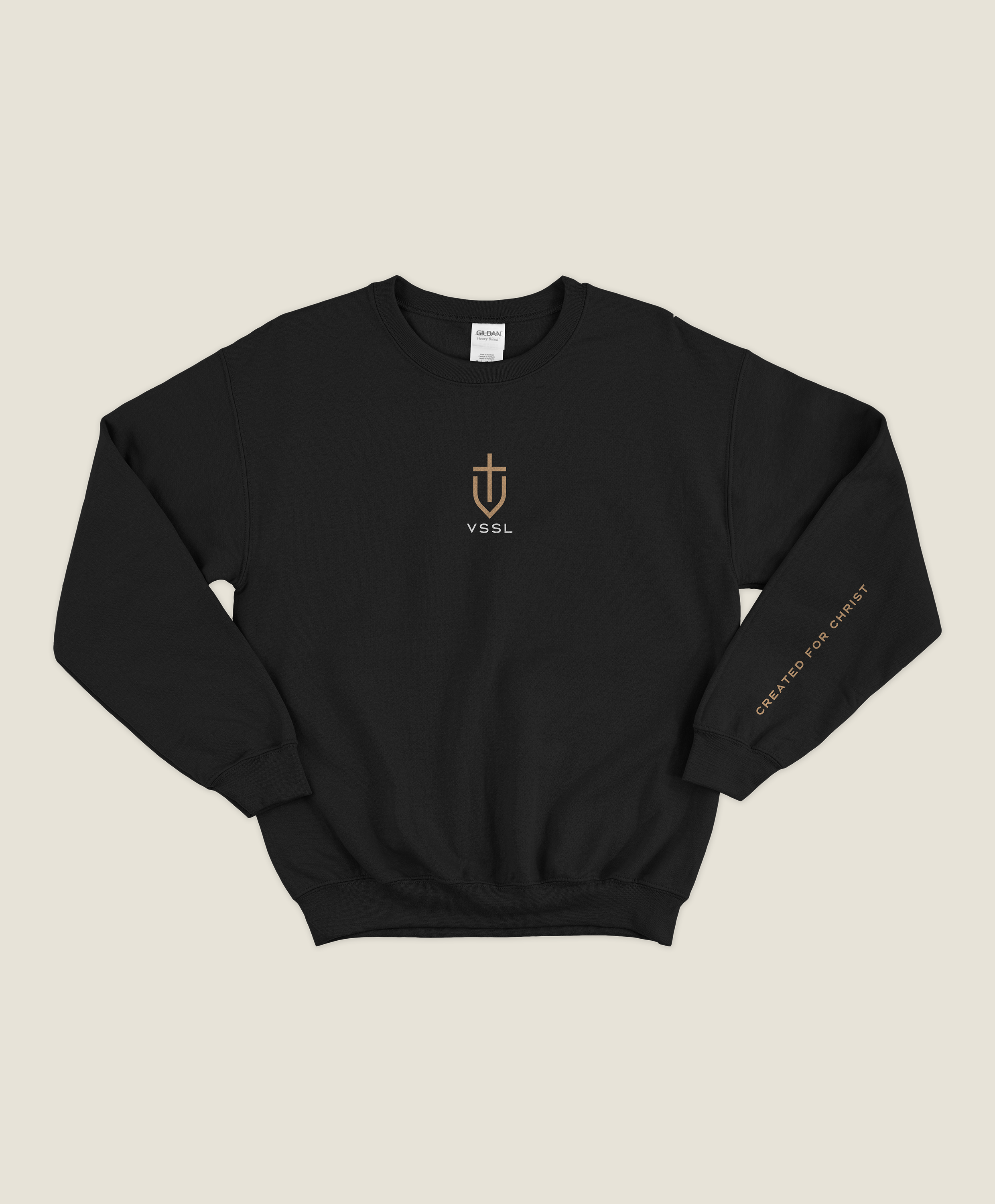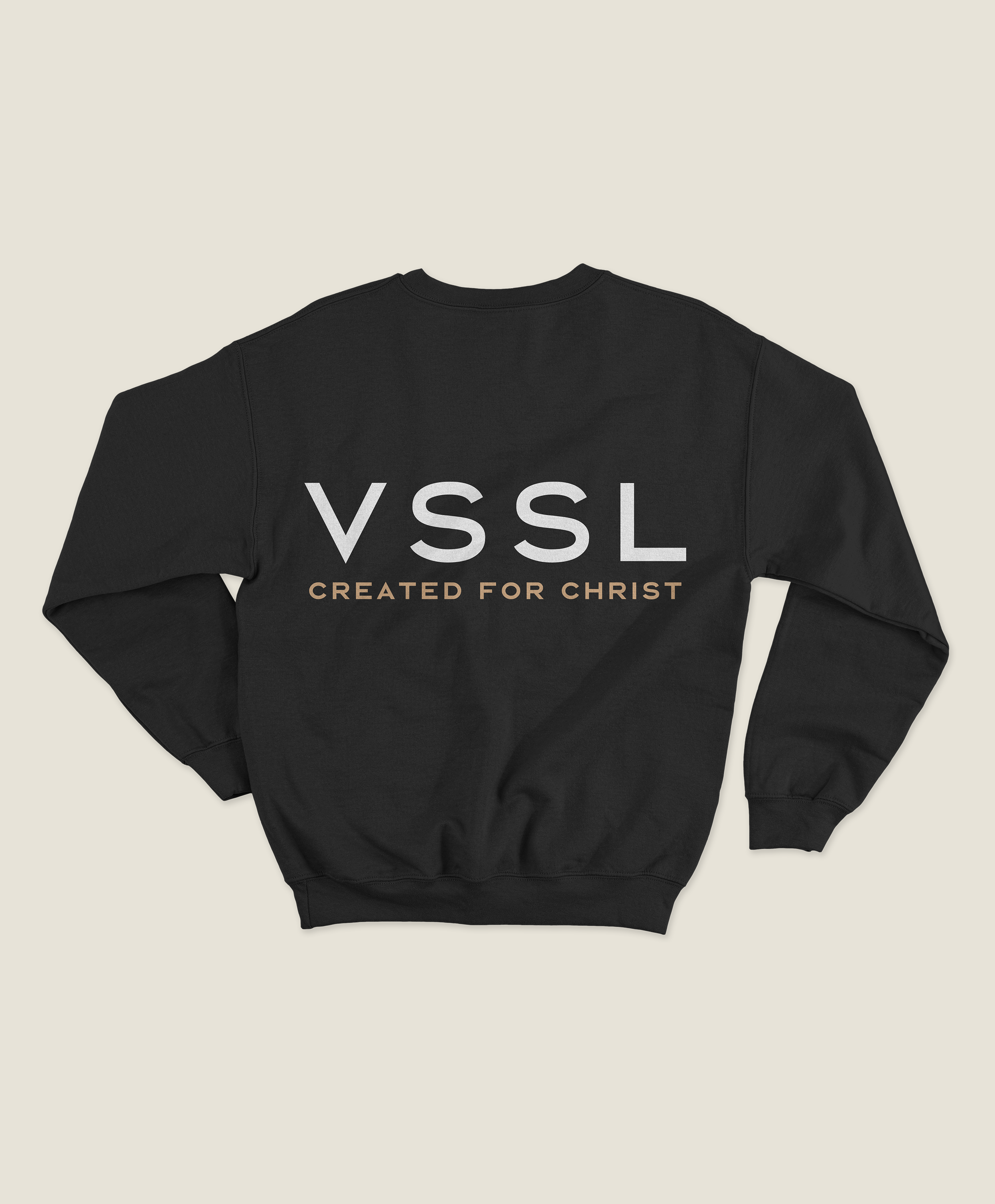 The front features the sleek VSSL logo on the chest, offering a minimalist yet powerful touch. On the back, the words “VSSL – Created for Christ” are boldly printed, while the sleeve carries the message “Created for Christ,” making this sweatshirt a visual declaration of who you are and what you stand for.